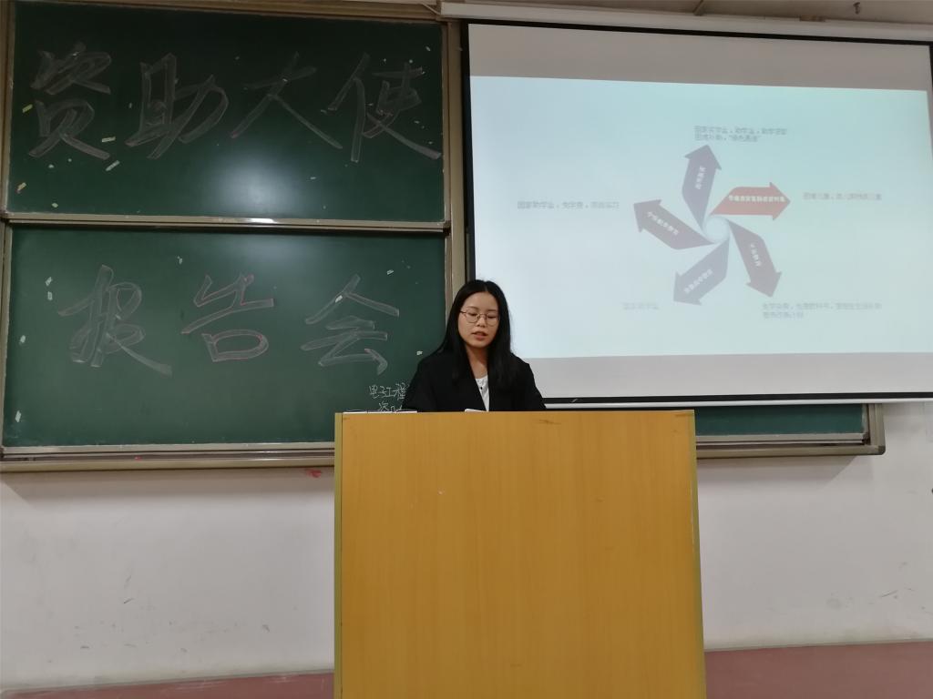 “资助大使”刘梦娟和尹栋分享了他们作为宣传大使的经历、感悟和思考。刘梦娟分享了自己的宣传经历对于宣传活动的心得:在这次活动中,她受益良多,每一次的交流,宣传不仅是政策的宣传更是一份力量。在此次活动通过资助宣传政策可以让每一个学生都更好的了解我国资助政策,保障了每个学生受教育的权利,通过资助可以让每一个贫困生都能成为国家核梁,进一步促进了我国教育事业的科学发展和人力资源强国的需要。