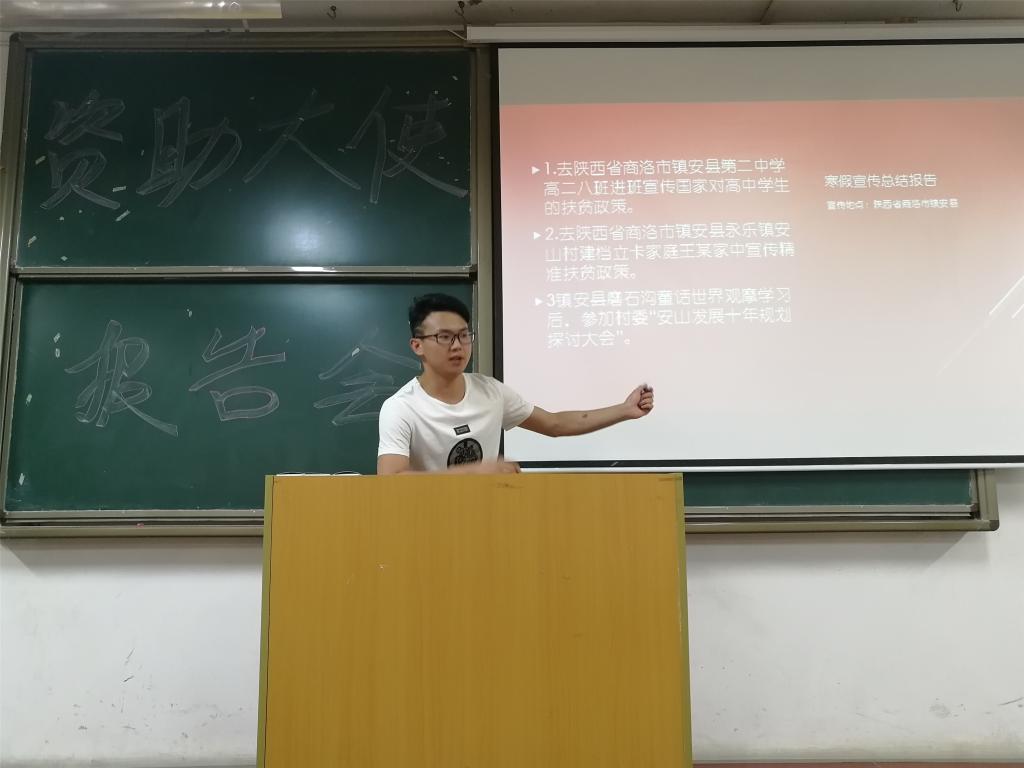 电子工程学院“学生资助宣传大使”,他们利用寒假,进村入户宣传资助政策,回到母校现身说法,帮助学弟学妹安心学习,扫除经济上的顾虑,广泛宣传国家资助政策,让更多受助学生及其所在家庭感受到来自党和国家、来自学校、来自社会的关怀和温暖,让更多还在与贫困战斗的同学感受到希望。