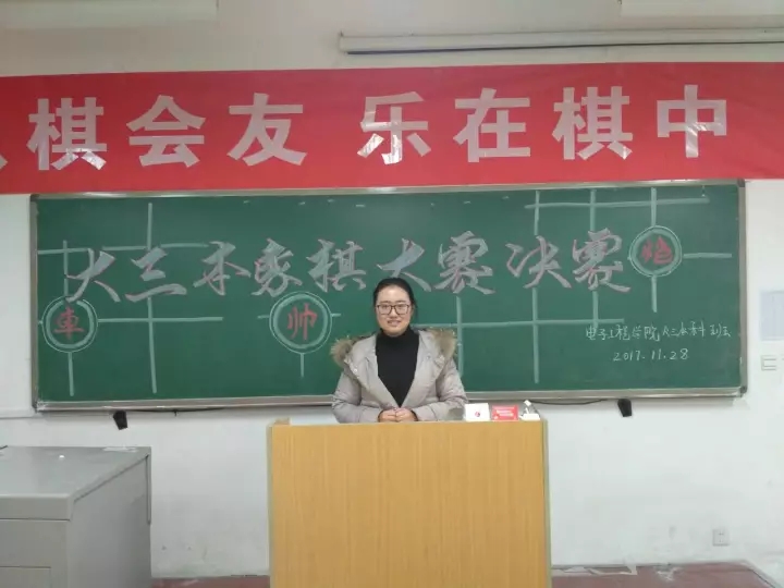 为继承中华民族优秀文化遗产,更进一步丰富大学生的校园生活。我院大三象棋类爱好者经过两场象棋淘汰赛,11月28日晚上在1331教室隆重举行了“大三本象棋比赛决赛”,此次大赛由电子工程学院大三本科班举办,决赛迎来了辅导员高蕾老师的到场。