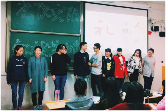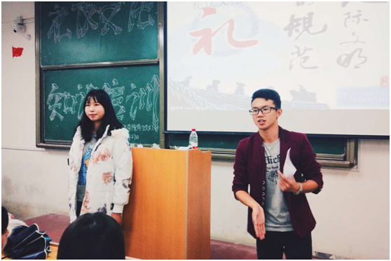 乔梦瑶向大家讲解了自己对礼仪的认知,以及如何合理的处理人际交往关系,她从自身出发,讲了许多自己身边有关礼仪交际有关事例,通过对比自身的感受来告诉女生应该如何礼貌的与他人交往,并强调在关注自身外在美的同时,应重视提升自己的内在美。尹栋以其开朗的性格和独特的演讲方式,赢得了再坐同学们的阵阵掌声。他主要讲了女生交际时的坐姿,站姿,以及如何与人握手拥抱才能彰显温文尔雅。在演讲过程中尹栋亲自示范动作,与台下女生和嘉宾进行互动,在与学生的互动中将现场气氛调动的十分热烈。在玩乐与欢笑声中,礼仪知识在不知不觉中传授。女工部部长刘攀子为本次活动进行了总结,并送上美好的期愿。