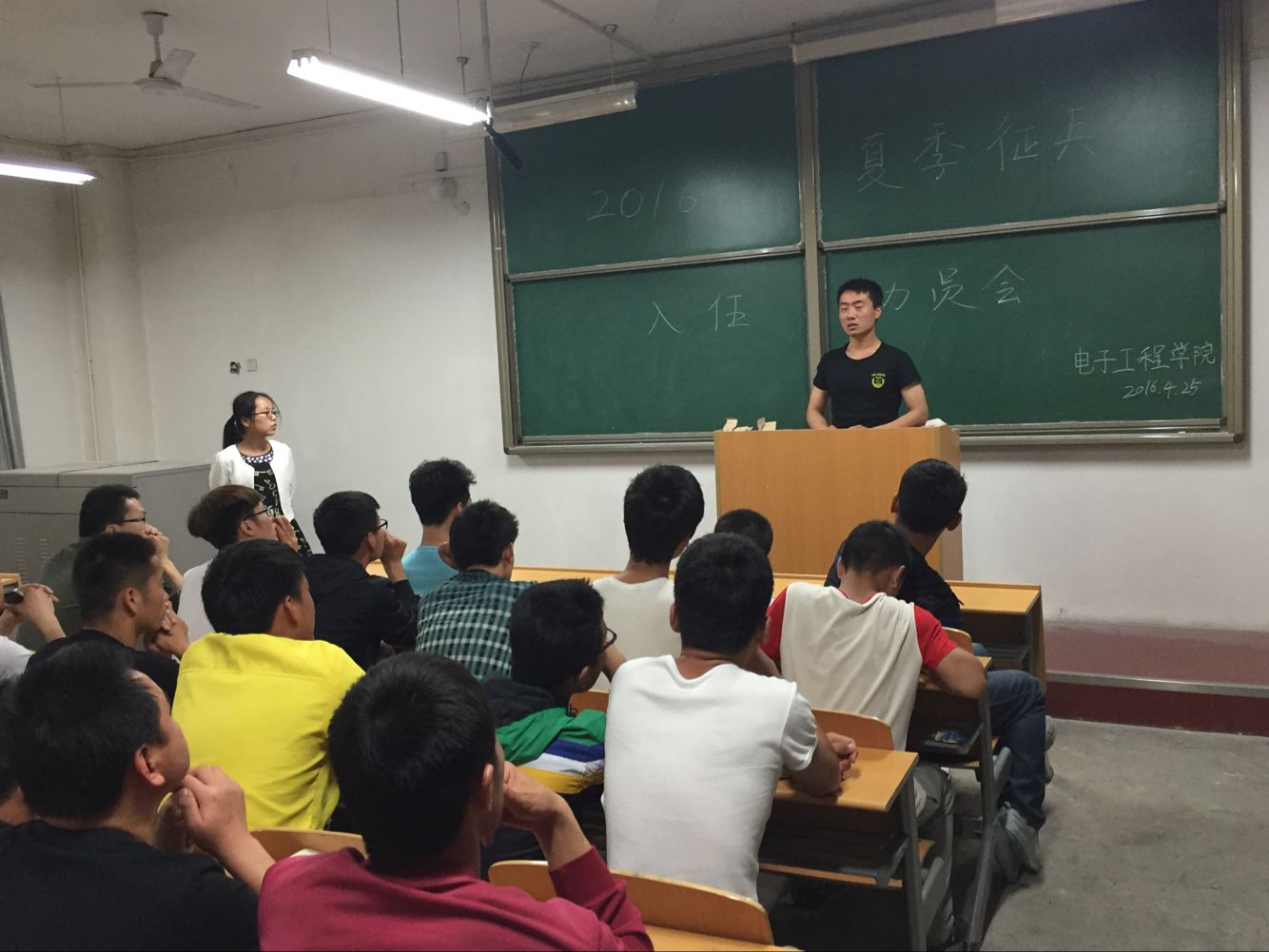 为宣传2016年夏季征兵工作,提高电子工程学院学生应征入伍的积极性,我院特于425日晚八点在阎教1320教室进行了2016年夏季征兵入伍动员会。本次动员大会的主讲人为张小妹老师和退役士兵郭林林学长,我院各班班长与有入伍意向的学生参加了此次动员会。