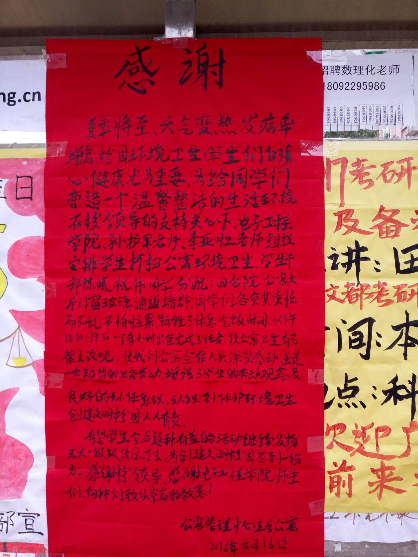 为培养学生的感恩意识,响应学校的雷锋月号召,电子工程学院大二本科在学生管理科科长孙护军老师、辅导员李亚胜老师的号召下,对五号公寓和教学楼三楼的公共教室进行了义务劳动。 2016年3月15日,测控技术与仪器和电气工程及其自动化两个专业的68名同学对五号公寓楼大厅、门窗、楼道和大门外围墙进行打扫,经过一个多小时的打扫,整个宿舍楼恢复了整洁干净明亮的环境。五号公寓宿管阿姨对学生的义务劳动表示感谢,并写了感谢信。