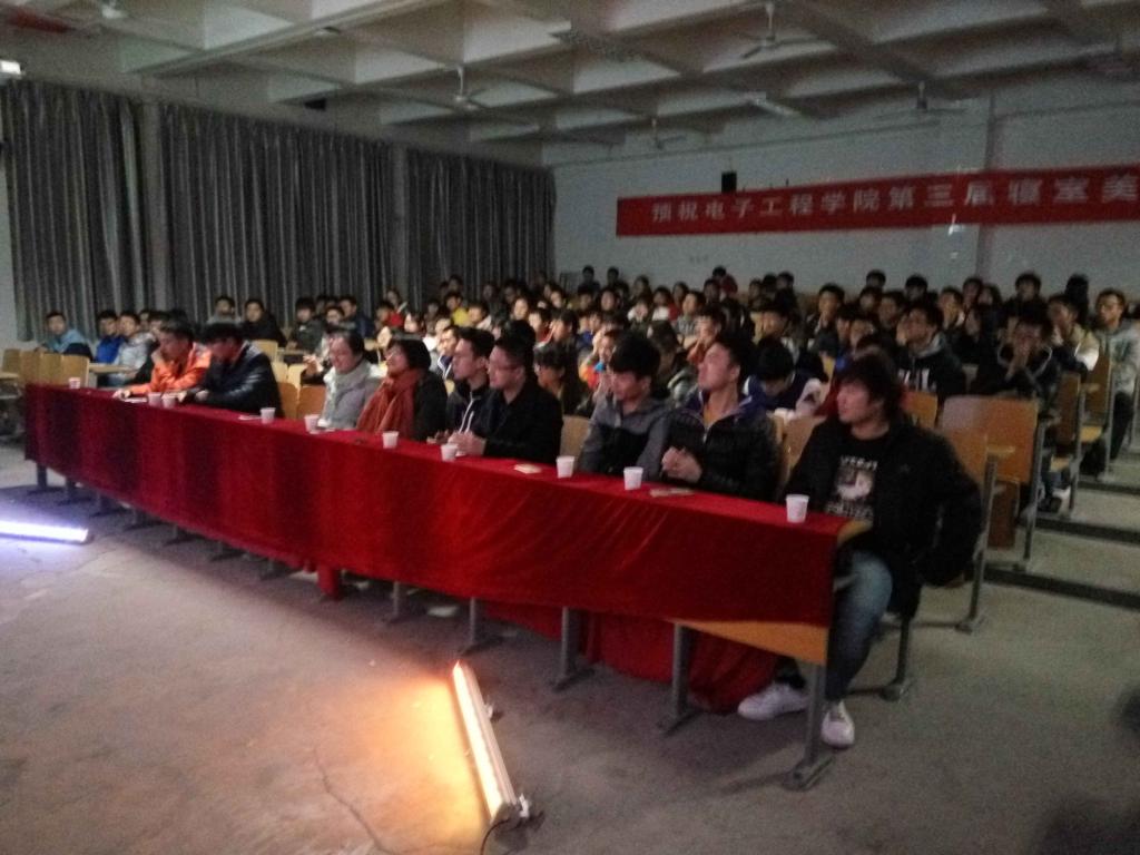 12月7日晚上19:00,电子工程学院“第三届寝室美化大赛”颁奖晚会在阶梯二教室举行。此次活动由电子工程学院学生会生活部主办,大一本科辅导员高蕾老师、大一专科辅导员肖静老师、学生会主席和各学生部门部长作为嘉宾出席了活动。