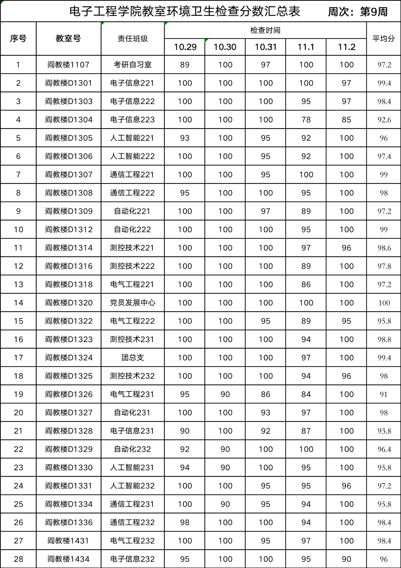 教室是学生学习的重要场所,为了进一步加强学生劳动教育,培养学生尊重劳动的价值观,维护教室的整洁卫生,营造良好的学习氛围,电子工程学院根据教室卫生责任制相关要求,每日对各班卫生责任教室进行环境卫生检查,现将第九周各班责任教室环境卫生检查结果通报如下: