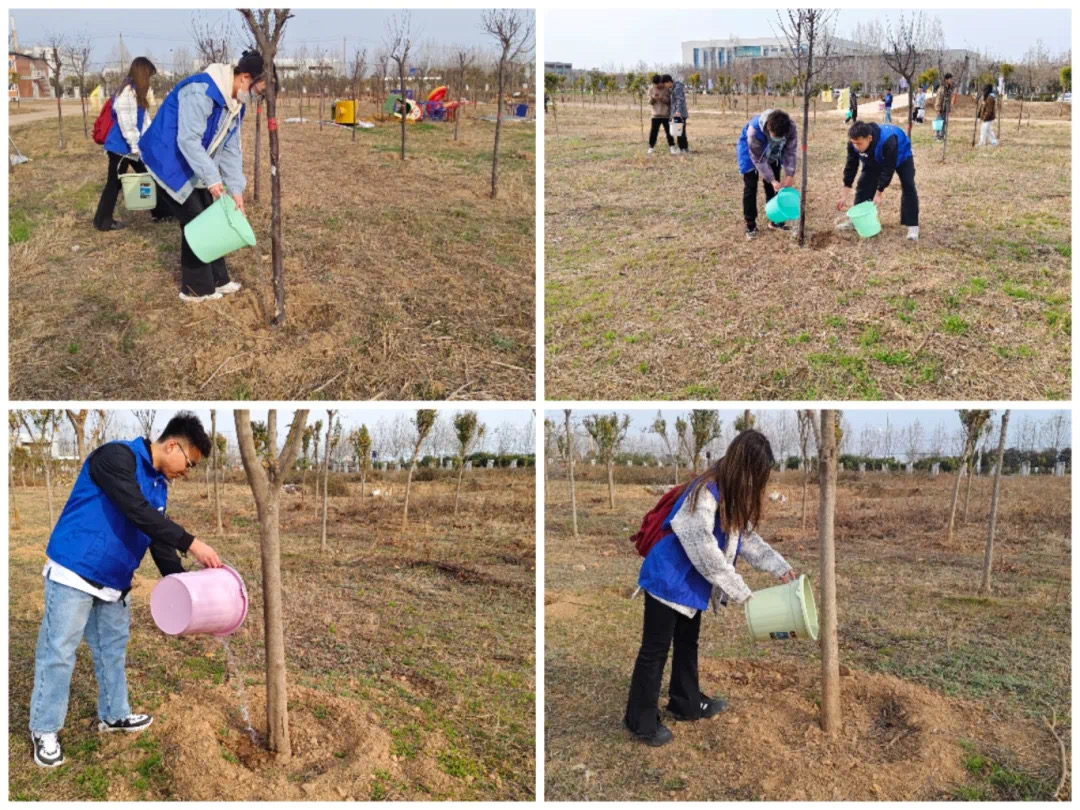 活动现场,各位志愿者分工协作浇水,检查每一棵树苗的成长情况,场面热闹且温暖。手中传递的水桶,脸颊流淌的汗水,无不展现着同学们的辛勤付出。2023年种下的树苗已然错落有致、迎风挺立,与同学们一起成长,在和煦春风里洋溢着勃勃生机。