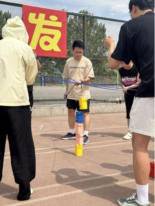 10人协同操作绳索搭建积木塔。有的队伍配合无间,塔身节节高升;有的队伍稍有不慎,重头再来。这个项目充分考验了团队的耐心默契