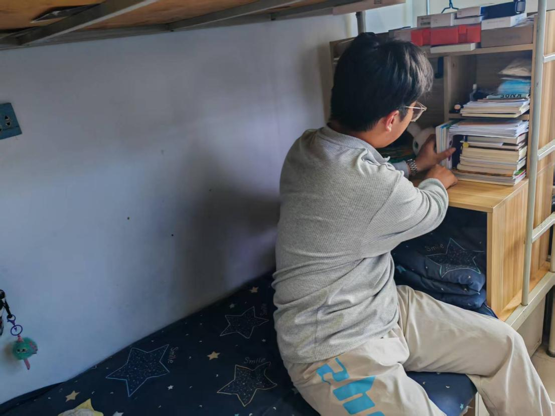 冯凯轩是电子信息222班的班长,他把自己形容为2号公寓2333宿舍的"空间规划师",始终相信整洁的环境是高效生活的基石。在他的书桌区域,分层置物架将课本、文具、日用品垂直分区,搭配透明收纳盒实现"一秒定位";衣柜采用可拆卸隔板,四季衣物按色系悬挂,换季时只需整体平移;床底滑轮箱收纳运动器材,墙面网格架悬挂钥匙、耳机等小物,让每寸空间都物尽其用。同时,他还注重实用与美学的平衡:统一色系的收纳工具让视觉更清爽,绿植摆件为功能分区增添生机。