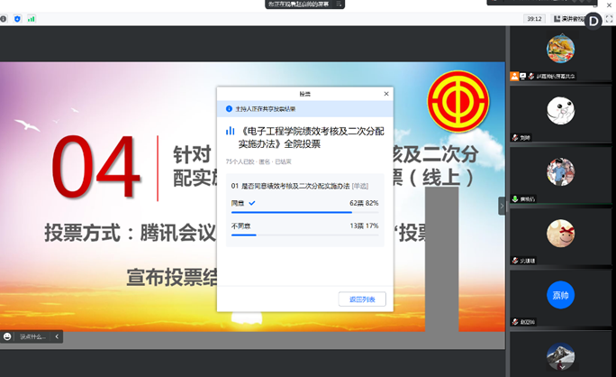 参会人员为75人,占全院人数80%以上,经投票统计,最终62票同意,13票不同意,同意绩效分配方案的人数达参会人数的82%,《电子工程学院绩效考核及二次分配实施办法》获得通过。