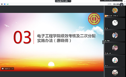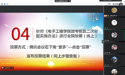会议共分为四个部分进行:会议分为四个部分展开,分别由唐晓倩向全员老师汇报了《2022年电子工程学院分会工作总结》和《2022年电子工程学院分会经费使用情况》,由肖海峰副院长代表学院向大会就《电子工程学院绩效考核及二次分配实施办法》做了讲解,由赵嘉帅老师主持针对《电子工程学院绩效考核及二次分配实施办法》进行了在线投票。