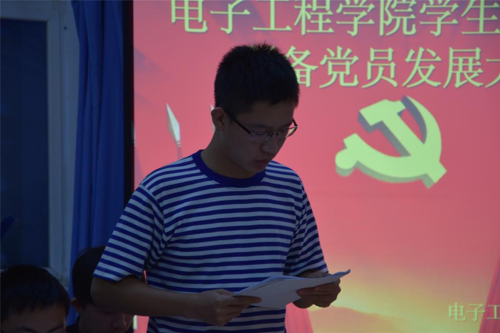 2018年5月21日,电子工程学院学生党支部在党团活动室举行电子工程学院预备党员发展大会。电子工程学院学生党支部书记孙护军,辅导员肖静、赵嘉帅,以及韩广建等27位发展对象出席本次会议,本次会议由学生党支部书记孙护军主持。