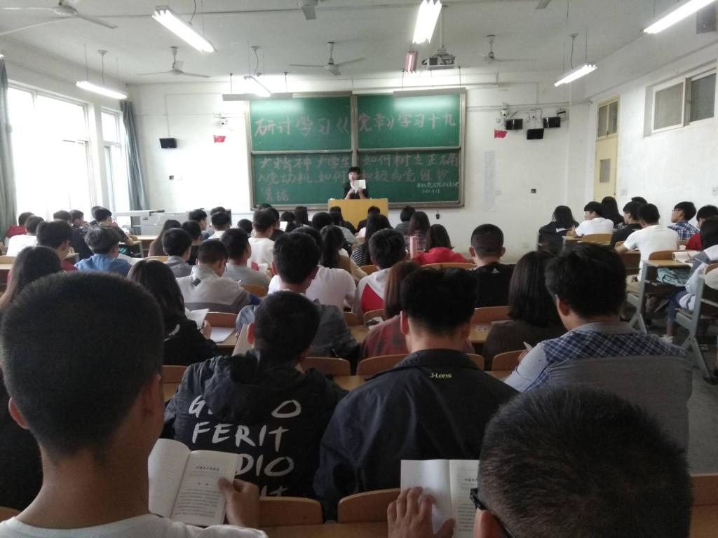 讨论会一开始,马晨向同学们讲解了新《党章》里面所增加的一些重要内容。每个人都在认真地听讲,做一些必要的笔记,对《党章》的内容有了一个深入全面的了解,使十九大精神能够在学生积极分子当中普及、传播。在讨论中,大家认识到党章的修订是党的指导思想与时俱进发展的需要,为新时代中国特色社会主义建设新征程指明了方向。