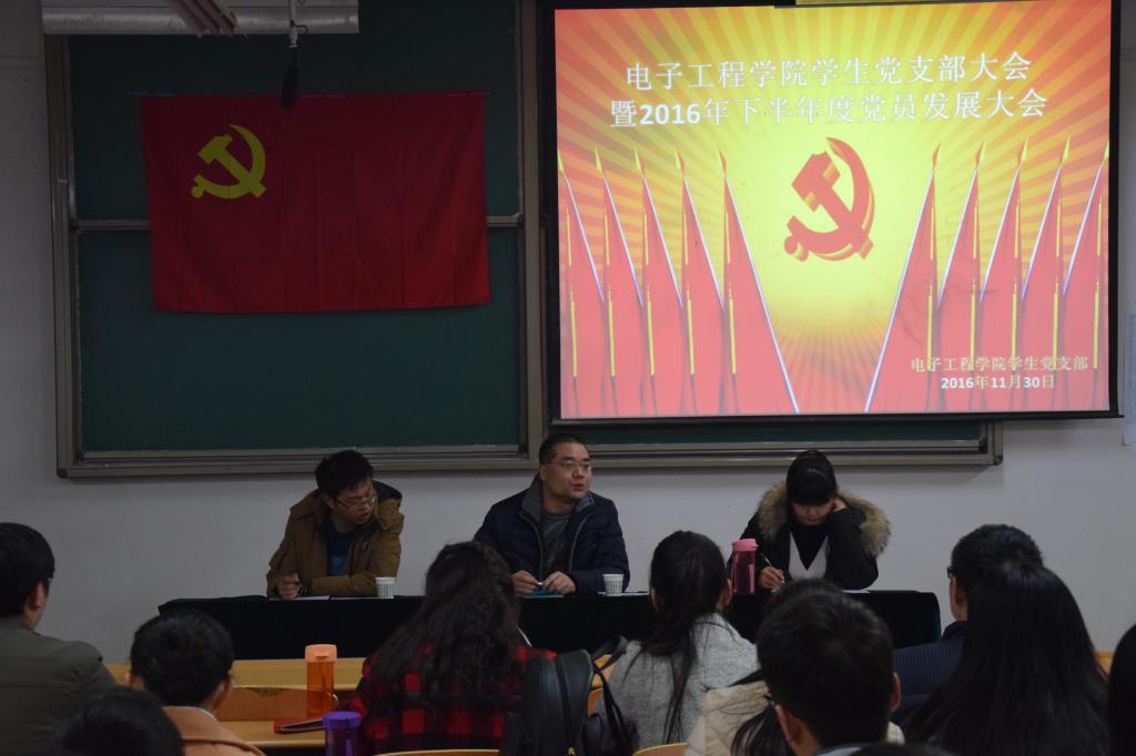 2016年 11月30日晚7点,电子工程学院学生党支部在阎教1320召开了预备党员发展大会,与会人员有学生党支部书记、学生管理科科长孙护军老师、组织委员杜阳宇老师、辅导员史珊珊老师,及本次入党的30名候选人。会议由学生党支部书记、学生管理科科长孙护军老师主持召开。