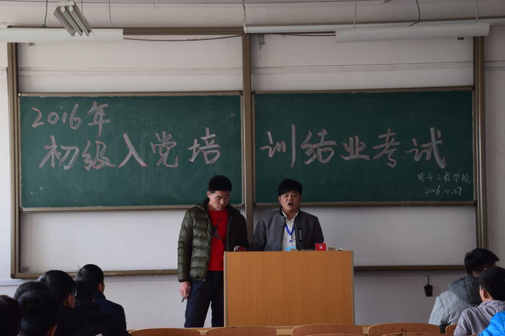 为检验党校第五期党的基础知识培训班培训效果,电子工程学院于2016年 11月27日下午14时在阎教楼3楼教室进行初级党课结业考试,电子工程学院全体大一新生参加此次考试。