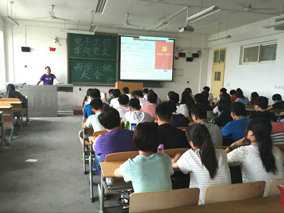 认真学习党章,牢固树立党章意识,对每一个党员的成长都有着巨大的帮助。电子工程学院学生党支部于6月6日晚17:55在阎教楼1336教室开展了“两学一做”的党章学习集中讲解教育活动,主讲人为电子工程学院学生党支部书记孙护军,党支部全体教工党员以及全体学生党员、预备党员共120人参加会议。