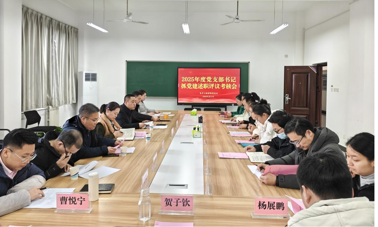 为深入落实新时代党的建设总要求与组织路线,压紧压实基层党支部书记政治责任,提升党建工作质量,2026年1月14日,电子工程学院召开2025年度党支部书记述职评议考核会。学院党总支书记李中、副书记杨亚萍、郝杰,党总支纪检委员杜栎,全体党支部书记及党员代表参会,会议由李中主持。