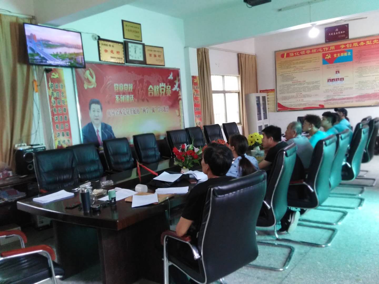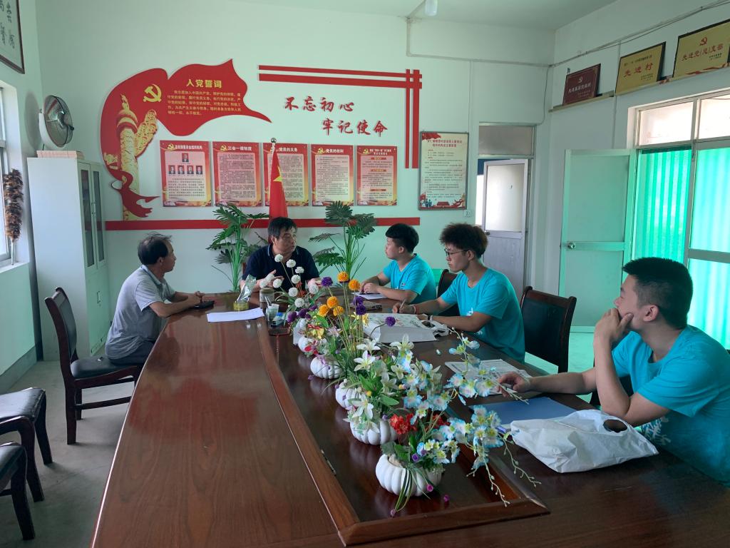 “榆你童行,同心协荔”实践队来到大荔县埝桥镇北黄村,村支书董树锁及其他村干部热情接待了实践队员,他们向大家介绍了北黄村的具体情况,北黄村辖8个村民小组,7832894人,耕地面积4354亩,其中有42户建档立卡贫困户,至今已经全部基本脱贫。了解完村里情况之后,村支书组织大家一同观看了“战役一线党旗红”纪录片。