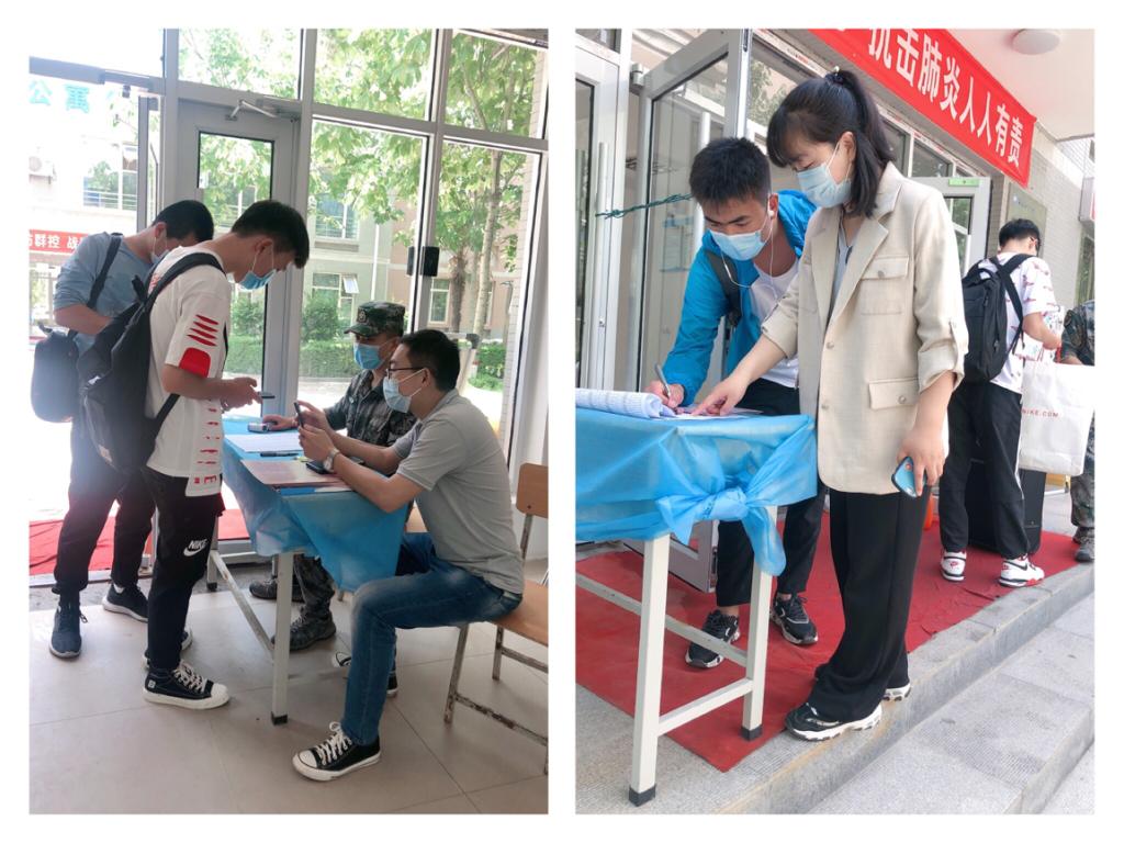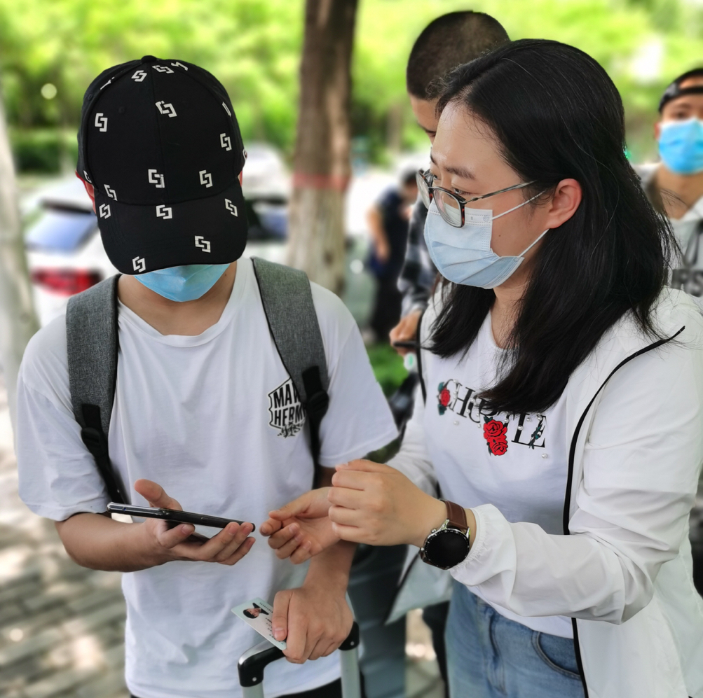 返校期间,按照返校接待方案,学生进入返校通道,辅导员老师有序引导学生完成身份核查、体温测量、智能测温系统测温、扫描西安市一码通进入校区。在公寓门口对行李箱、个人进行消毒,登记个人信息,扫描返校二维码,确保学生们返校安全、舒心。