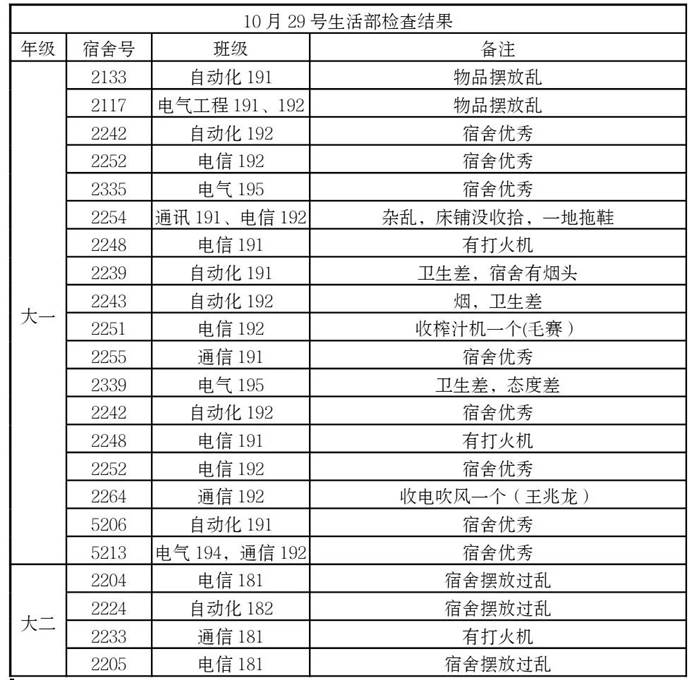 宿舍问题一直是学院高度重视的问题,为了提高同学在宿舍的卫生意识,促进同学养成良好习惯,消除宿舍卫生安全隐患,给同学们创造良好的生活环境。为此,生活部对大一全体宿舍进行卫生安全排查。在本次查宿活动中,大部分宿舍都能做到合格,但仍存在问题,最大的问题就是只注重形式,应付检查,不能保持。现将检查结果通报如下: