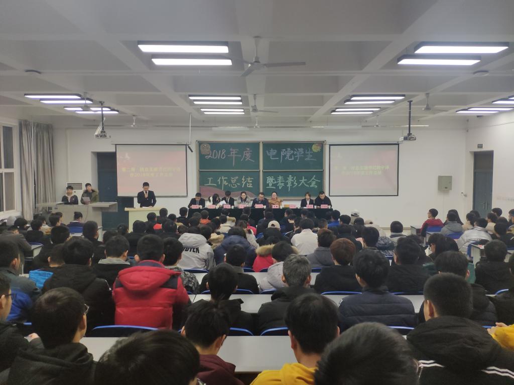 年末将至,电子工程学院一学年的团学工作接近尾声。2018年1月9日晚七点,电子工程学院在阶梯二教室举行了“电子工程学院2018年度学生工作总结暨表彰大会”,学生管理科科长孙护军,团总支书记肖静,党支部宣传委员高蕾,团总支副书记阴宇泽、于金,学生会主席常锐,心灵驿站站长侯敏,团学工作监察委员会主席白泽,易班工作站站长焦鑫甜,团学干部以及各类奖项获奖代表参加了此次会议。