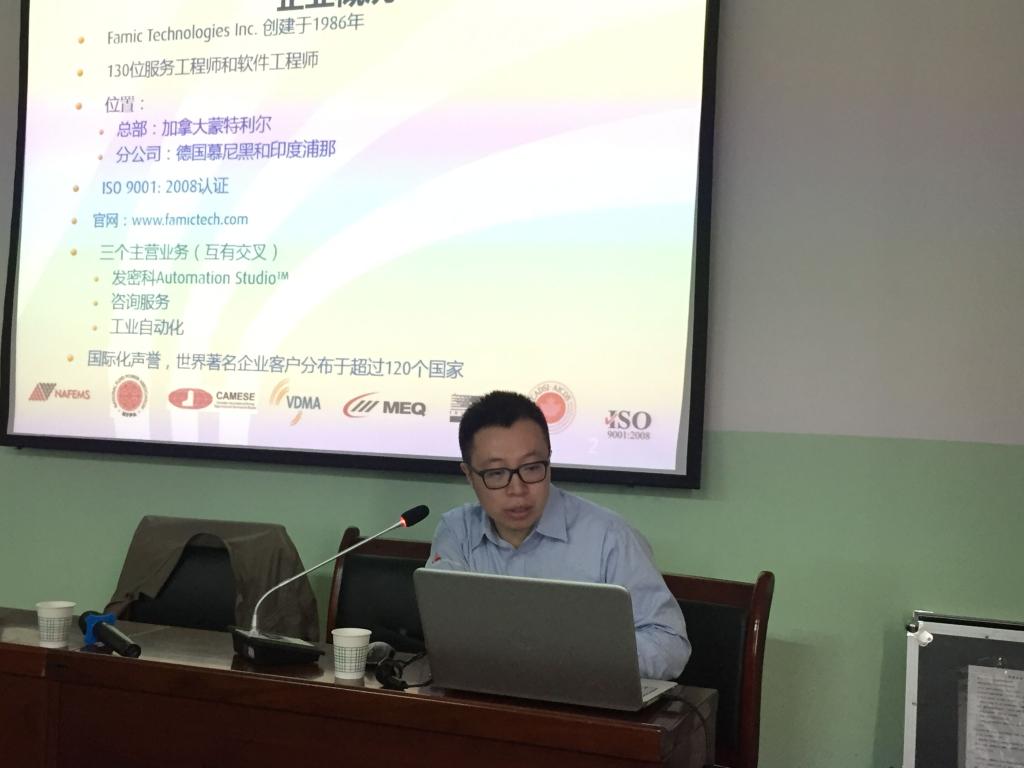王伟峰先生在报告会中,从加拿大Famic公司的讲起,介绍了其主打仿真软件Automation Studio被清华大学、西安交通大学等国内上百所高校的采用情况,详细阐述了软件在车辆、液压和电气等领域的应用,并现场演示了仿真PLC控制飞机起落架等诸多实例,展示了软件友好的界面操作环境。会后,参会教师与两位主讲人热烈互动,并就软件功能向企业提出新的要求。