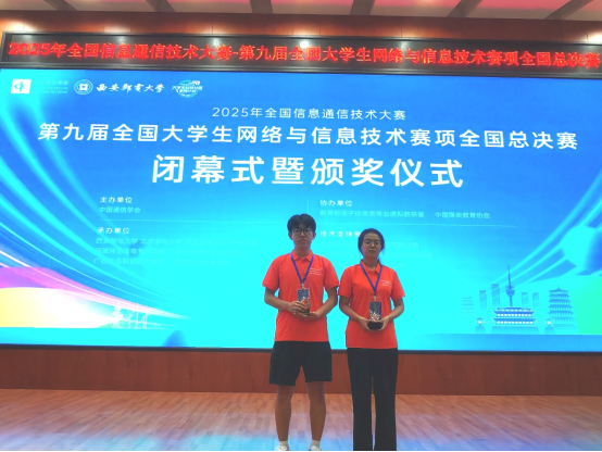 8月23日,2025年全国信息通信技术大赛——第九届全国大学生网络与信息技术赛项全国总决赛在西安邮电大学圆满落幕。我校电子工程学院教师李军芳、王丽带领通信工程专业学生芦阳、电子信息工程专业学生南乔乔积极参赛,经过激烈角逐,最终荣获二等奖、三等奖各一项,为学校和学院争得了荣誉。