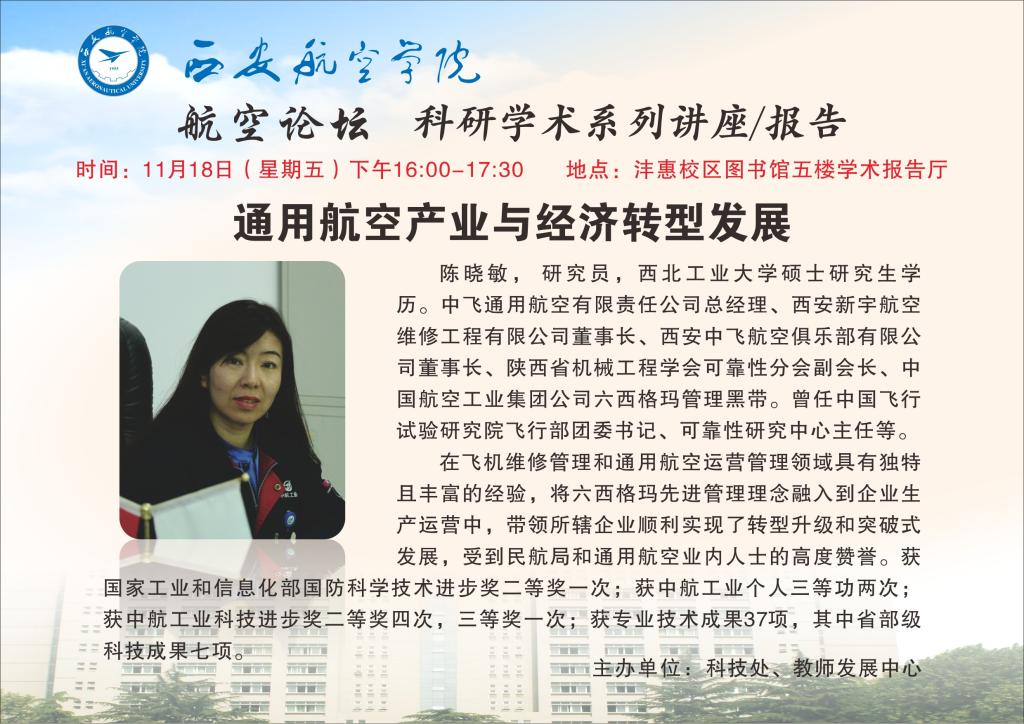 为促进学术交流,提高学术氛围,便于师生了解通用航空产业及其对经济转型发展的作用,科技处特邀中飞通用航空有限责任公司总经理陈晓敏来我校作题为“通用航空产业与经济转型发展”的学术讲座,欢迎广大师生踊跃参加。