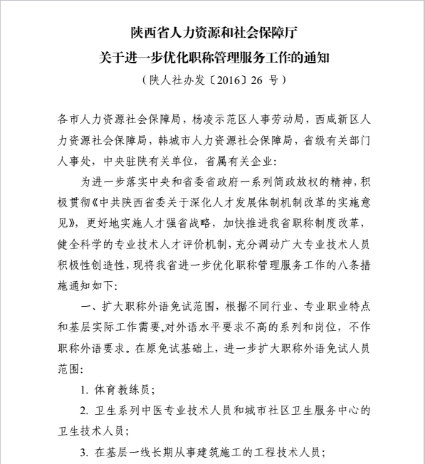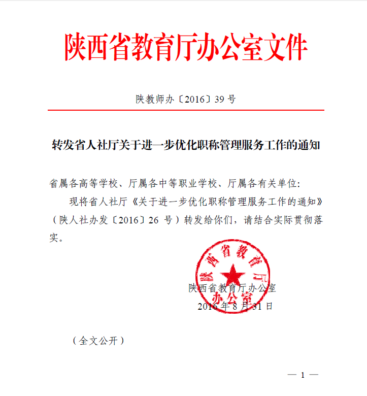 近期陕西省教育厅下发了关于《转发人社厅关于进一步优化职称管理服务工作的通知》(陕教师办﹝2016﹞39号),现将该文件予以转发,请各单位高度重视,组织相关人员进行学习。