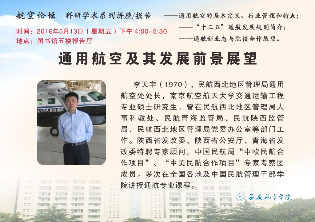 为促进学术交流,提高学术氛围,便于师生了解通用航空的现状、趋势和发展战略,科技处特邀请民航西北地区管理局通用航空处处长李天宇来我校作题为“通用航空及其发展前景展望”的学术讲座,欢迎广大师生踊跃参加。