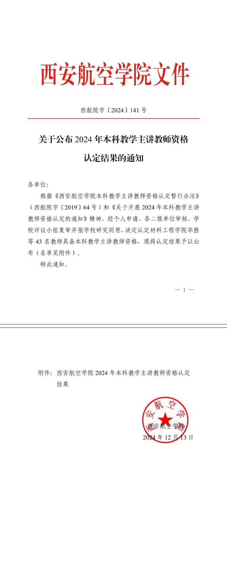 关于公布2024年本科教学主讲教师资格认定结果的通知