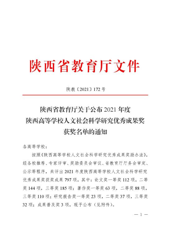 关于公布2021年度陕西高等学校人文社会科学研究优秀成果奖获奖名单的通知
