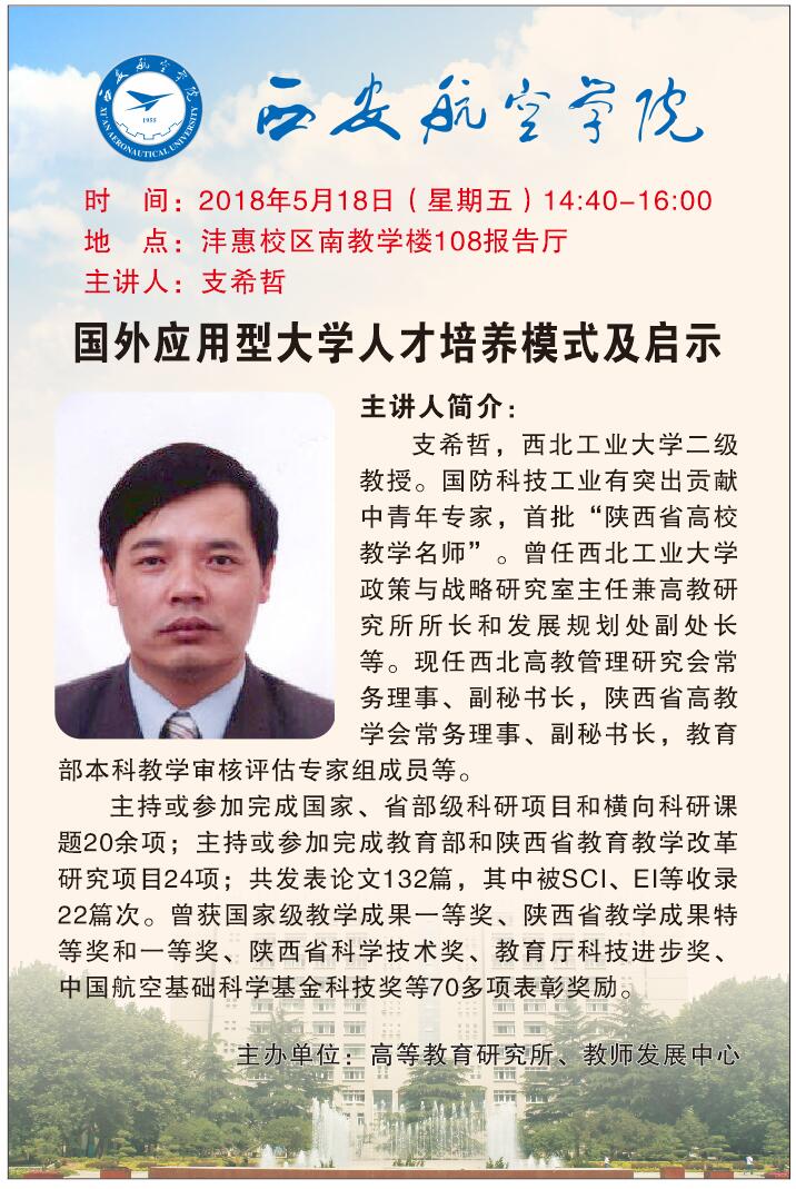 为促进学术交流,营造学术氛围,便于师生了解和把握国外应用型大学人才培养现状及发展趋势,科技处特邀西北工业大学支希哲教授来我校作题为“国外应用型大学人才培养模式及启示”的学术讲座,欢迎广大师生踊跃参加。现将相关事项通知如下: