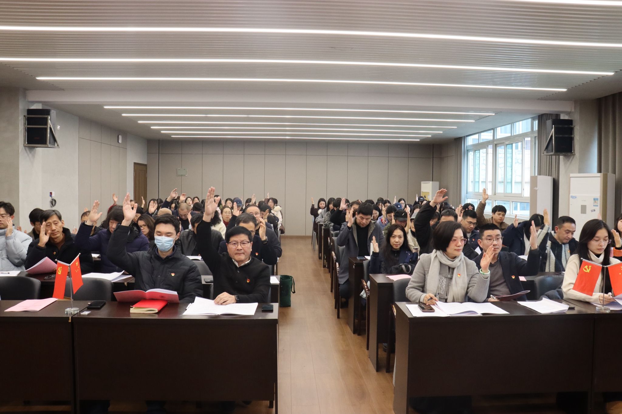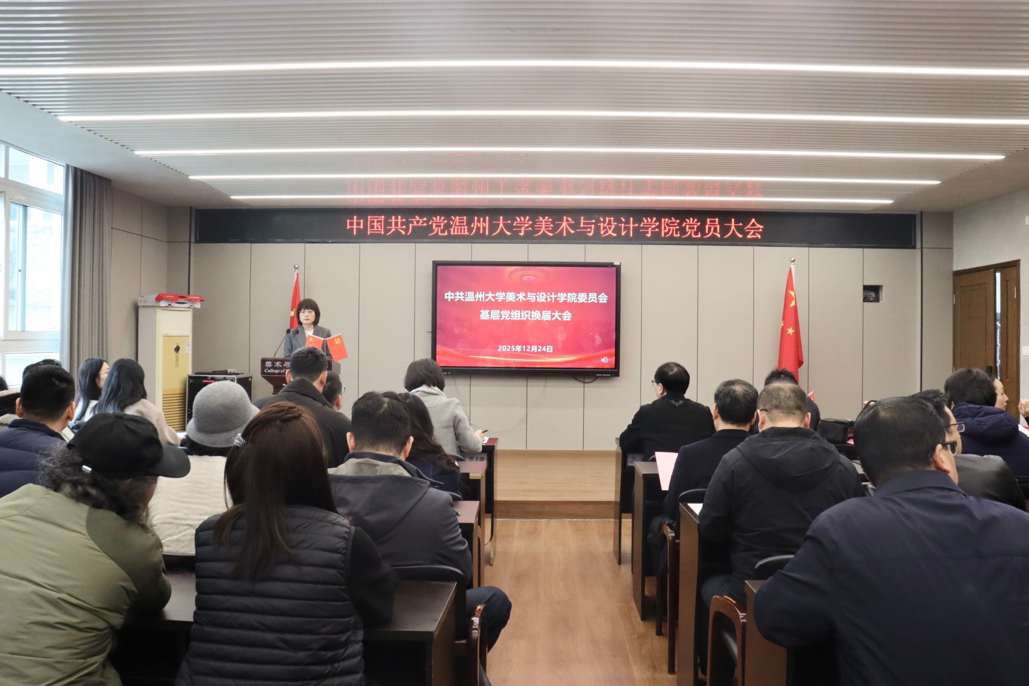 2025年12月24日下午,中共304永利集团官网入口党员大会在庄严的国歌声中隆重开幕。全院党员齐聚美术楼2B4001会议室,共同回顾总结过去五年的奋斗历程,擘画未来五年的发展蓝图,选举产生新一届党的委员会和纪律检查委员会。大会现场气氛庄重而热烈,洋溢着团结、民主、奋进的气息。